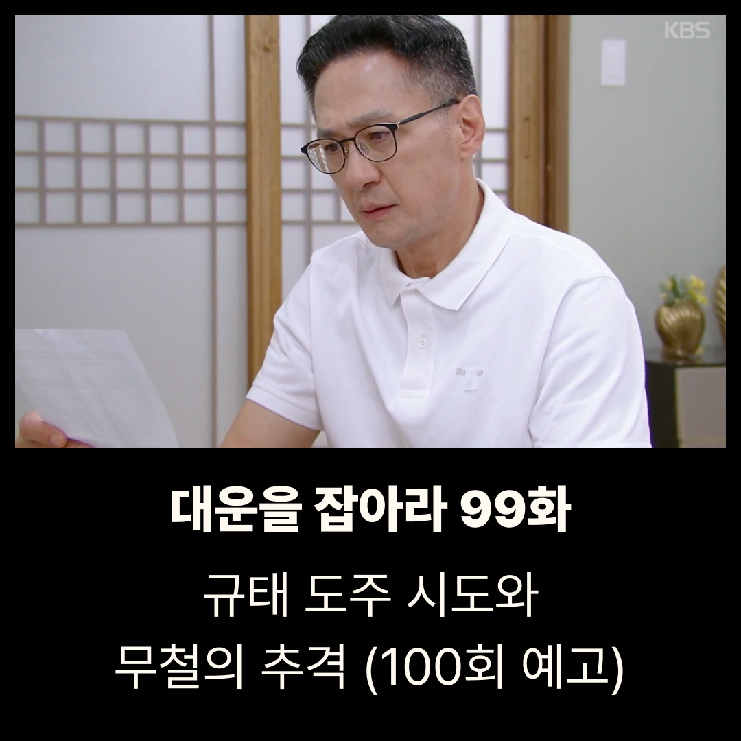 대운을 잡아라 100회 예고에서는 무철이 규태의 집에 들이닥쳐 그를 추격하는 장면이 공개되었습니다. 경찰은 무철에게 장태풍 계좌의 돈을 왜 건드렸는지 추궁했고, 규태는 “대운빌딩은 내 것”이라며 끝내 모든 것을 토해낼 수 없다고 다짐했습니다. 파국을 향한 마지막 대결이 예고되었습니다.